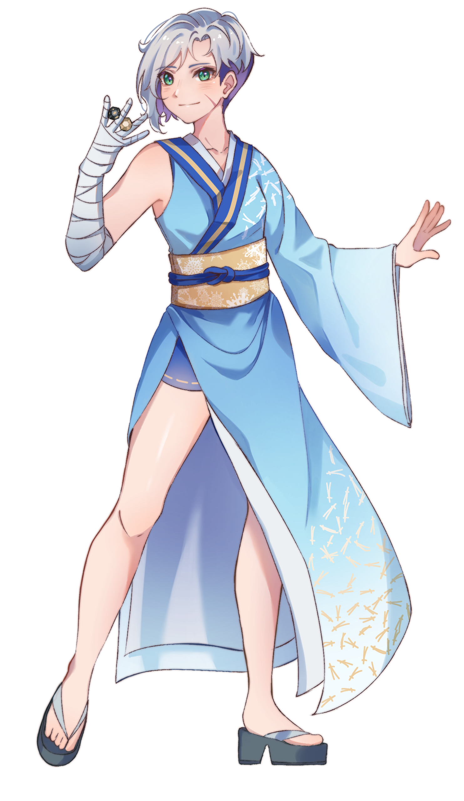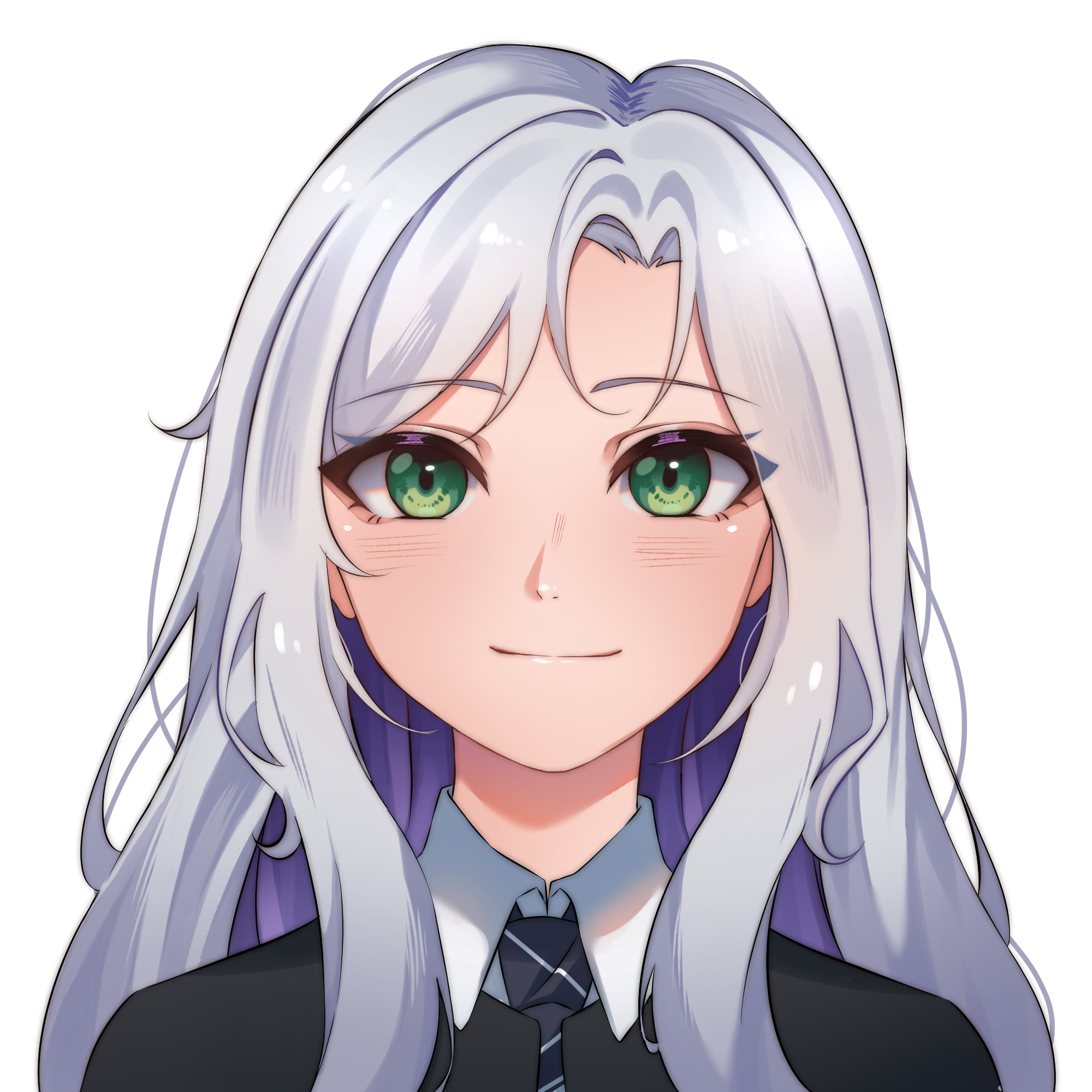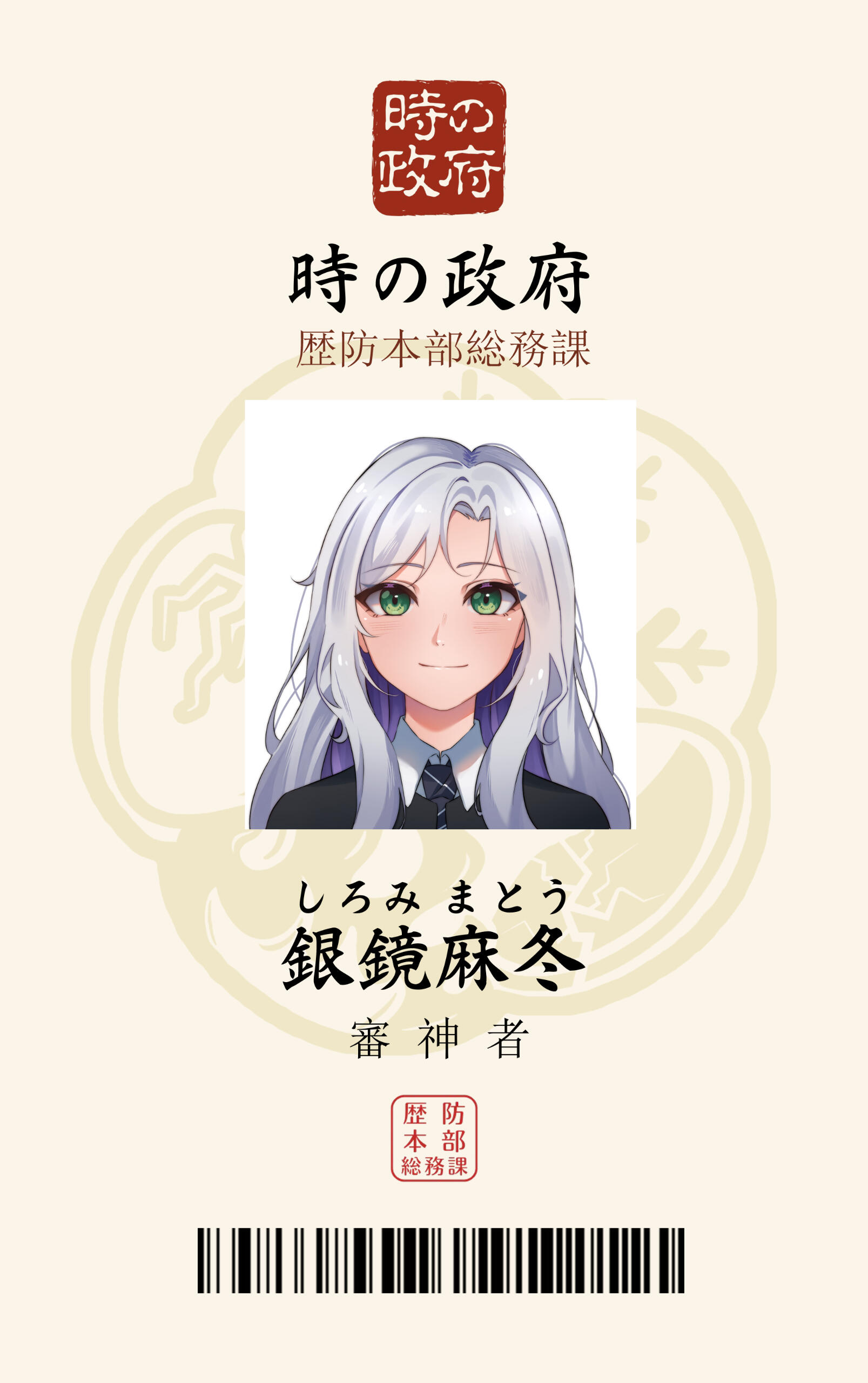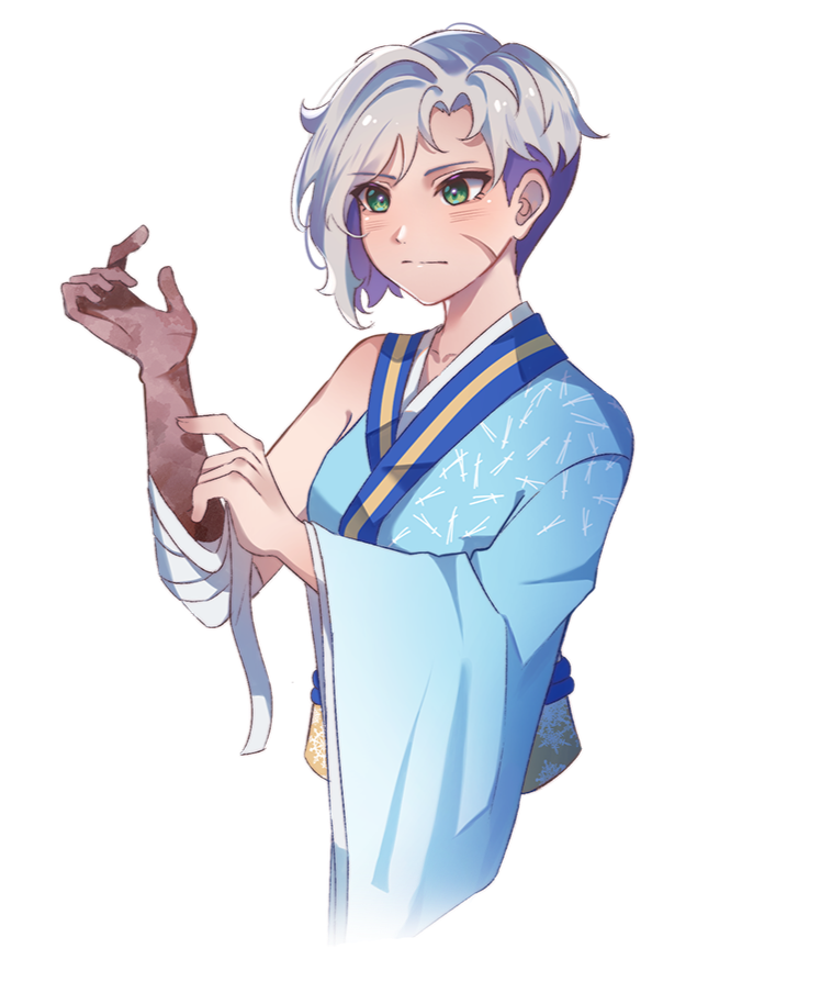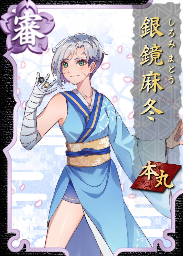 Shiromi Matou's appearance in the real world and in Honmaru is different. This was an uncommon phenomenon that only happened because Matou traveled through the timeline using Honmaru's time machine. When she's injured in the Honmaru, it doesn't appear on her body in the real world, only in her Honmaru appearance. But, if she was to get injured in the real world, the scar would appear in her Honmaru body.In the real world, she has a chest-length wavy white hair with purple peek-a-boo. She doesn't have any scars from her normal appearance.In the Honmaru, she has short white hair with an under-cut on her left side, and she still has the purple peek-a-boo. There's a cut scar on her left cheek and a burn scar on her right hand. She usually covers her hands with a bandage, only a few of her Touken Danshis know about her scar under the bandage.Before becoming a Saniwa, she has usual green eyes, but after being awakened twice, she has a blue-ish glint in her eyes. It's more apparent in her Honmaru appearance, but if you look closely under the sunlight, you can also see it in the real world. She's 158 cm tall with ideal weight. She was 17 years old when she first awakened as a Saniwa.There are two Saniwa identification barcodes on both of her wrists from the Government of the Time. The first Honmaru barcode is on her right hand and the current Honmaru is on her left hand. The first Honmaru identification barcode is unreadable anymore because of her injury, including in her normal appearance. The barcode still can be seen under the special light, but it's unreadable.