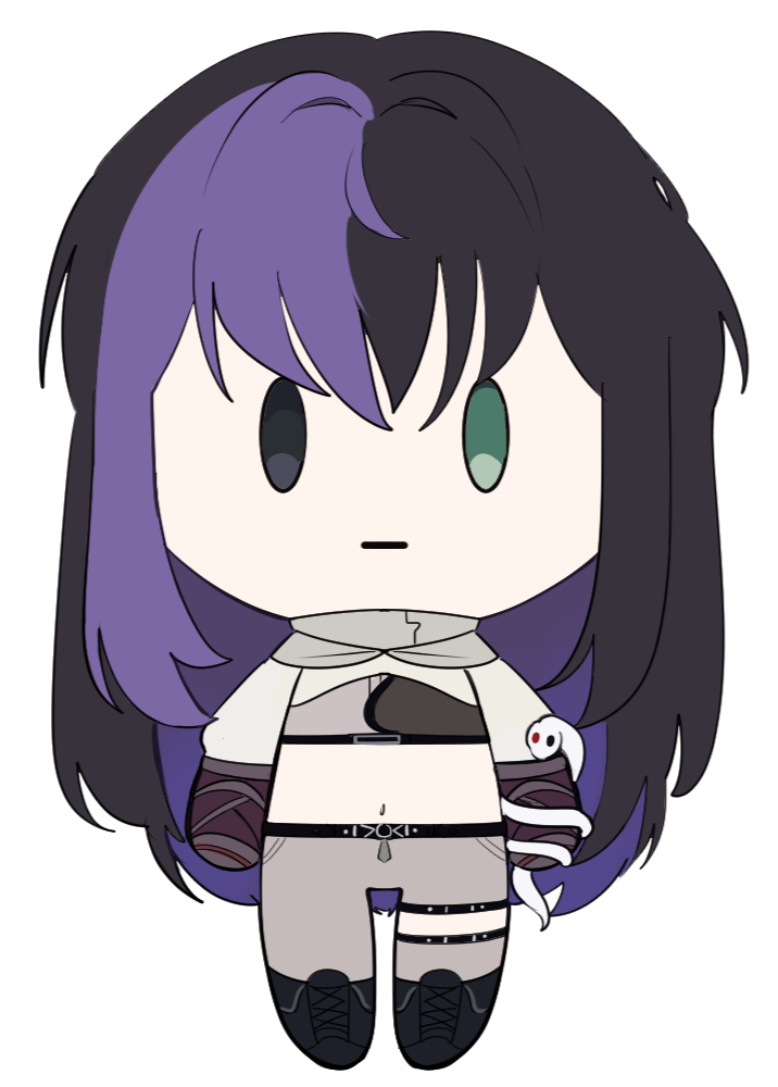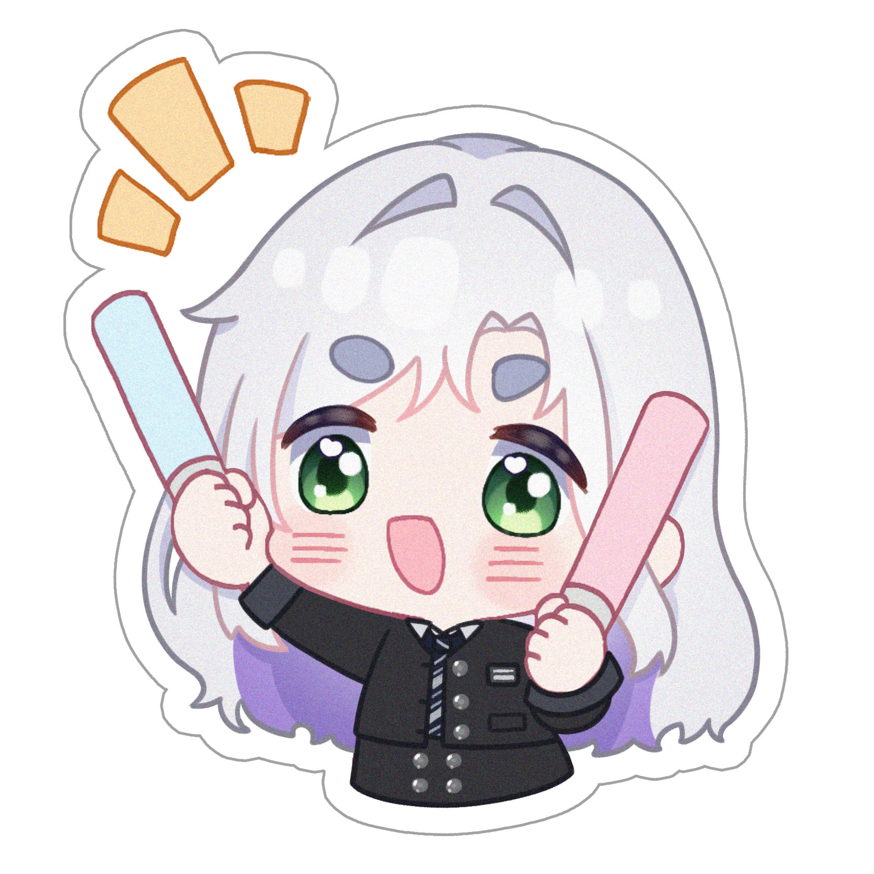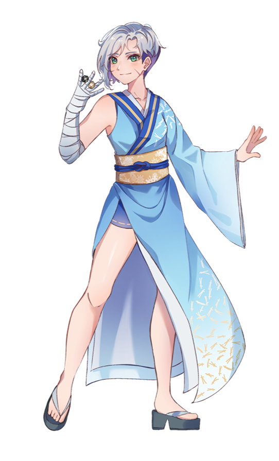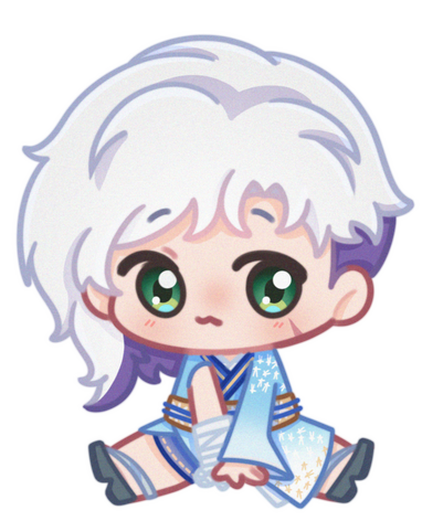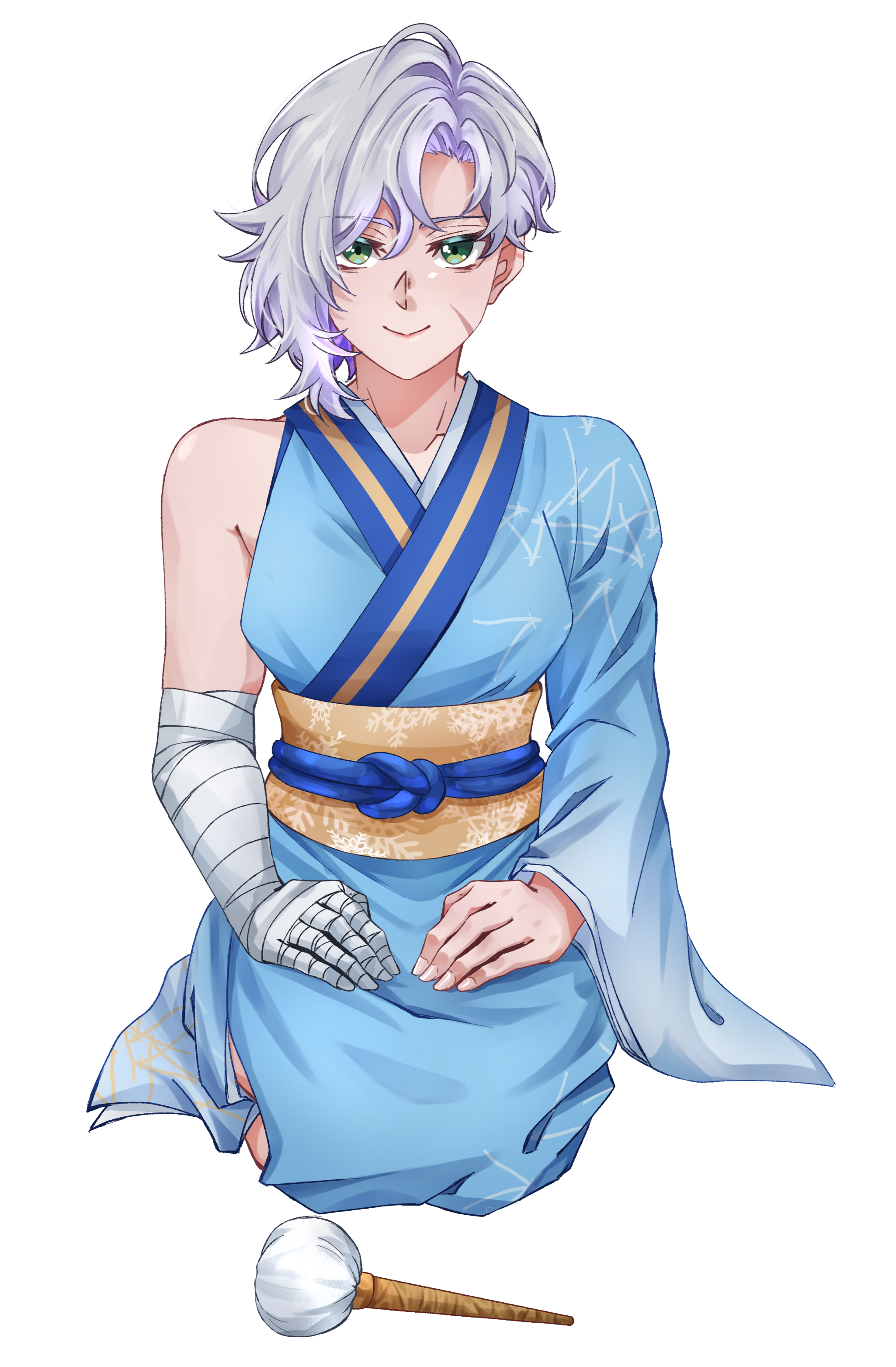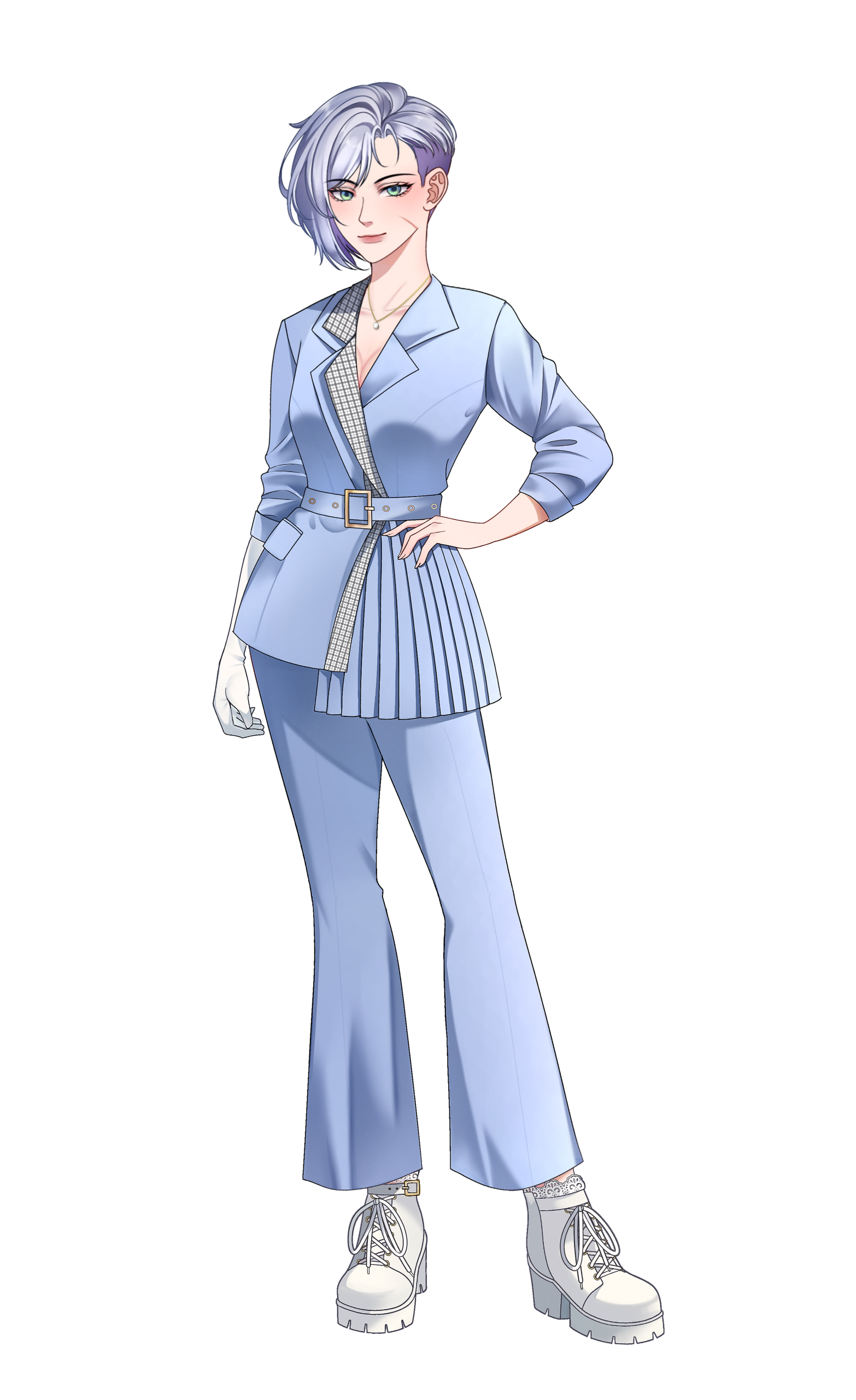 Shiromi Matou's appearance in the real world and in Honmaru is different. This was an uncommon phenomenon that only happened because Matou traveled through the timeline using Honmaru's time machine. When she's injured in the Honmaru, it doesn't appear on her body in the real world, only in her Honmaru appearance. But, if she was to get injured in the real world, the scar would appear in her Honmaru body.In the real world, she has a chest-length wavy white hair with purple peek-a-boo. She doesn't have any scars from her normal appearance.In the Honmaru, she has short white hair with an under-cut on her left side, and she still has the purple peek-a-boo. There's a cut scar on her left cheek and a burn scar on her right hand. She usually covers her hands with a bandage, only a few of her Touken Danshis know about her scar under the bandage.Before becoming a Saniwa, she has usual green eyes, but after being awakened twice, she has a blue-ish glint in her eyes. It's more apparent in her Honmaru appearance, but if you look closely under the sunlight, you can also see it in the real world. She's 158 cm tall with ideal weight. She was 17 years old when she first awakened as a Saniwa.There are two Saniwa identification barcodes on both of her wrists from the Government of the Time. The first Honmaru barcode is on her right hand and the current Honmaru is on her left hand. The first Honmaru identification barcode is unreadable anymore because of her injury, including in her normal appearance. The barcode still can be seen under the special light, but it's unreadable.
