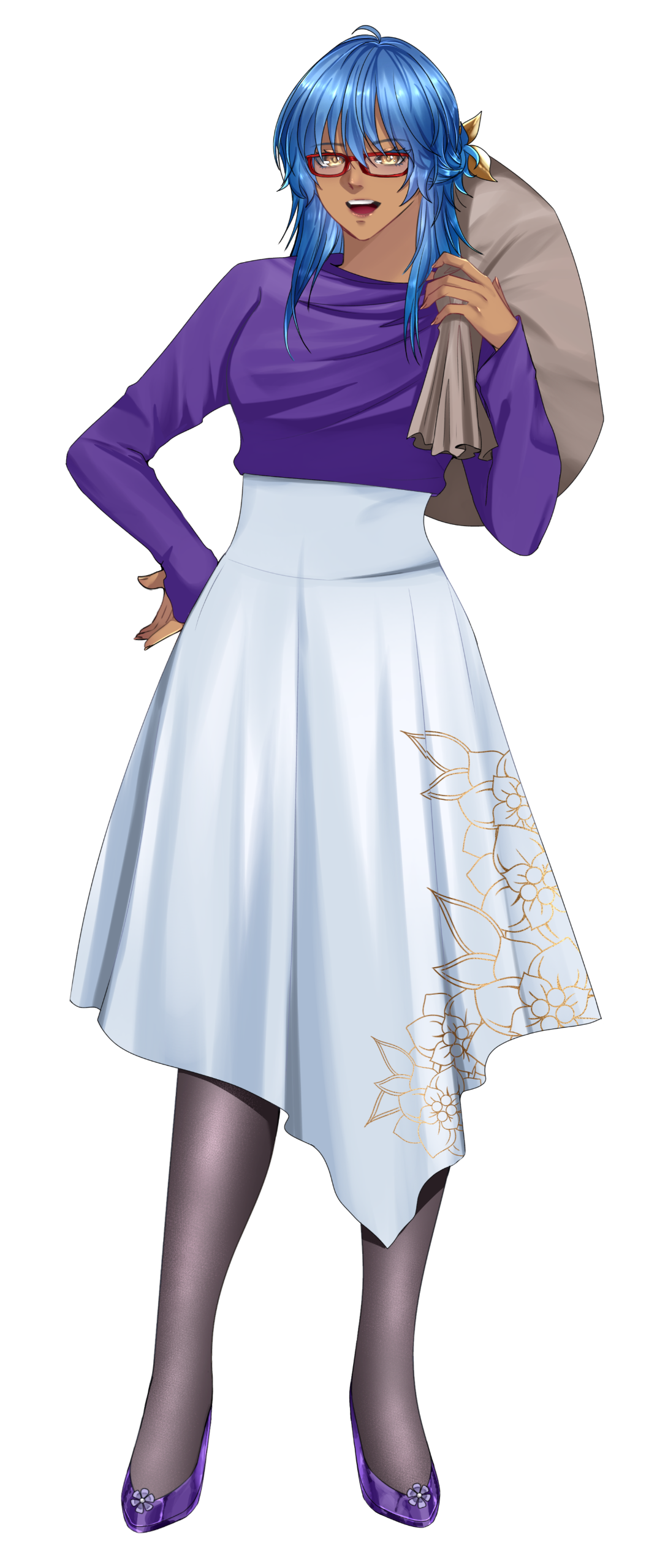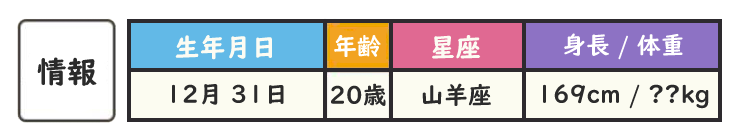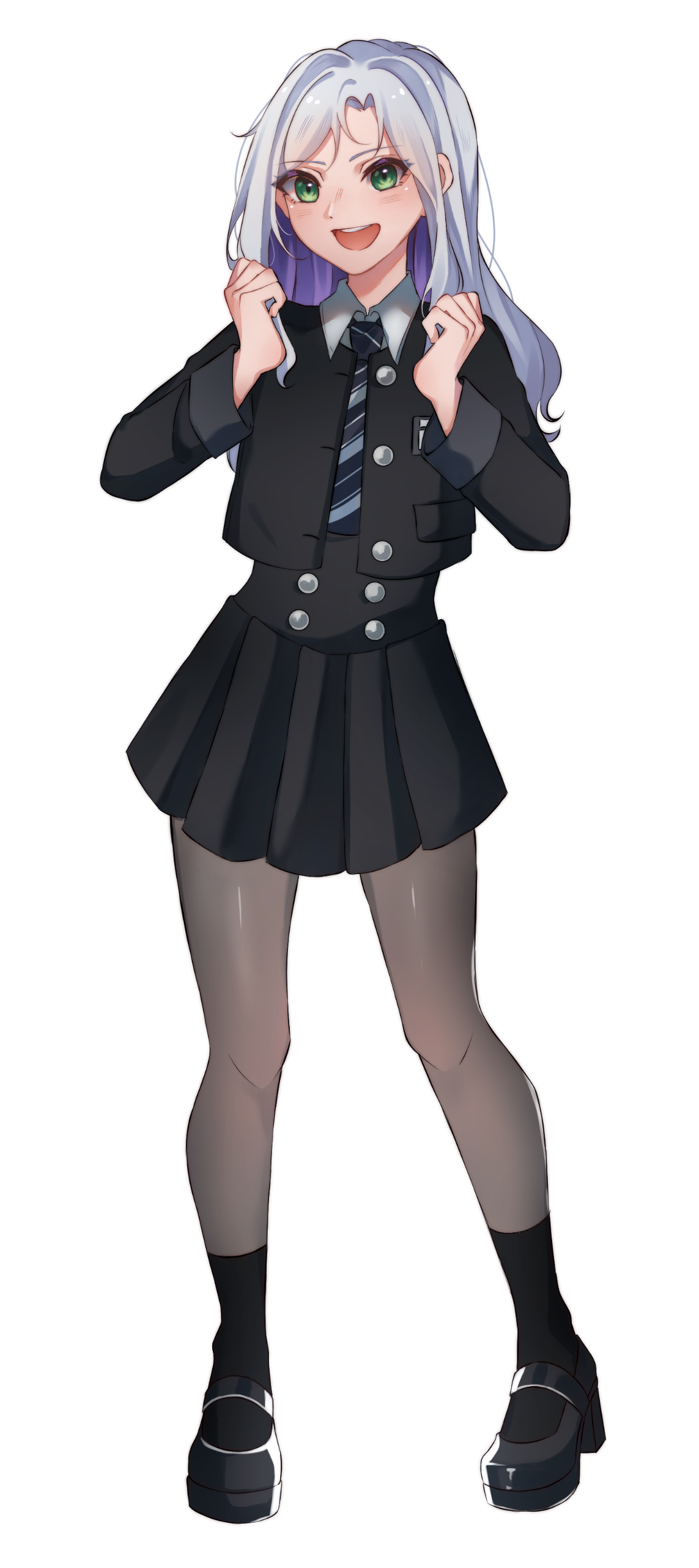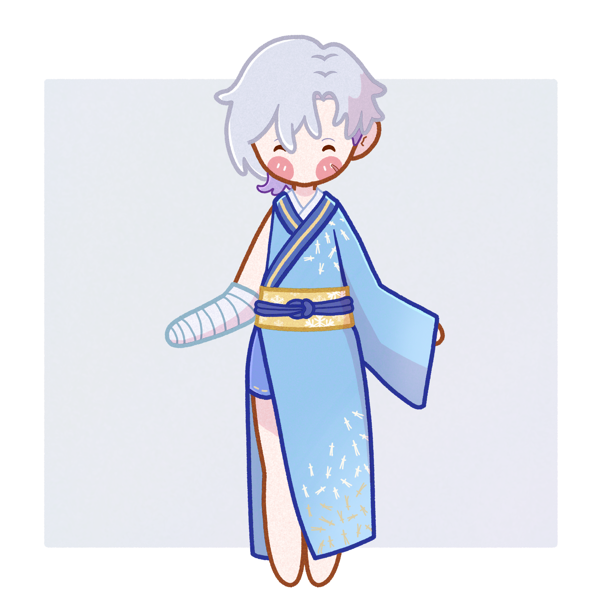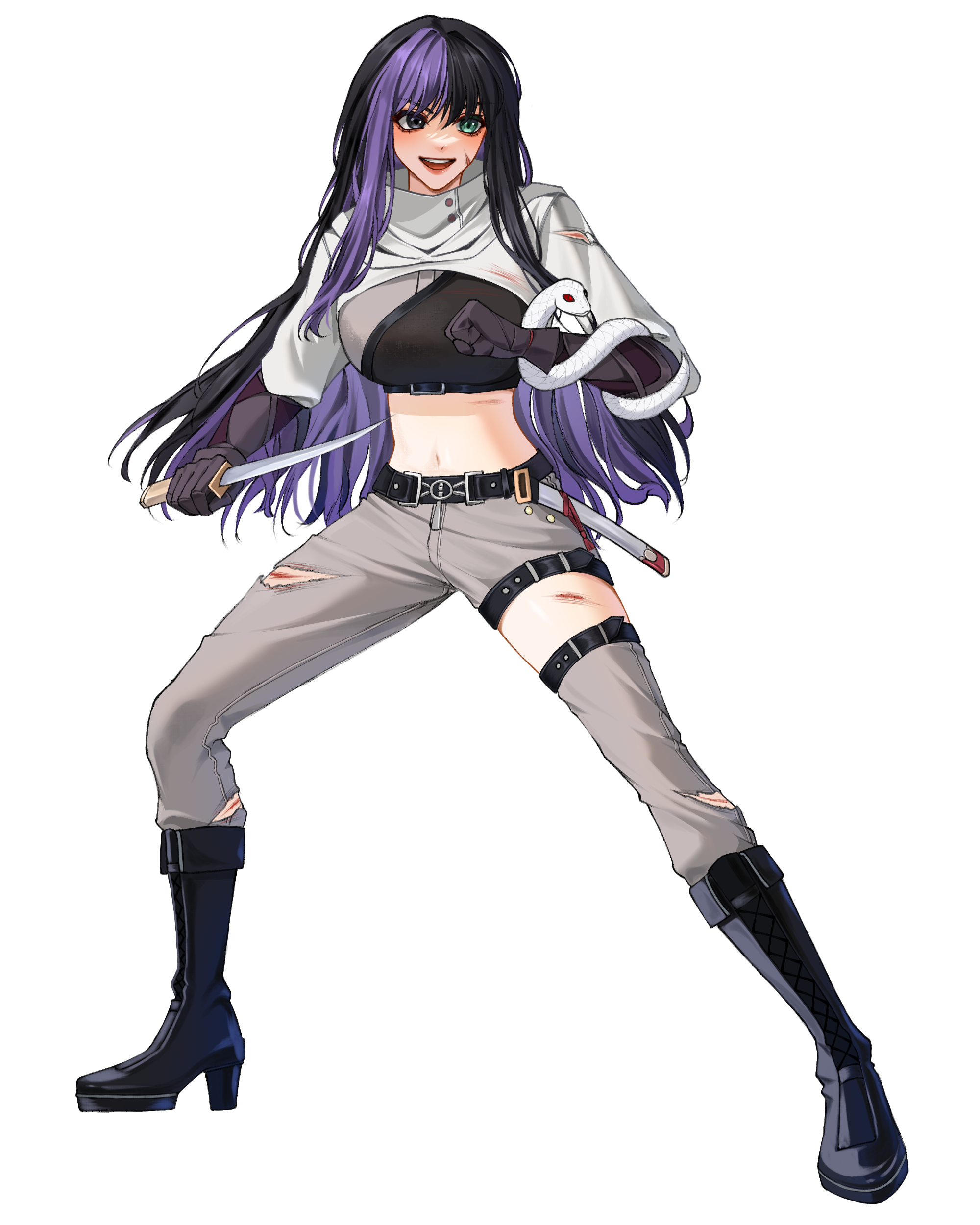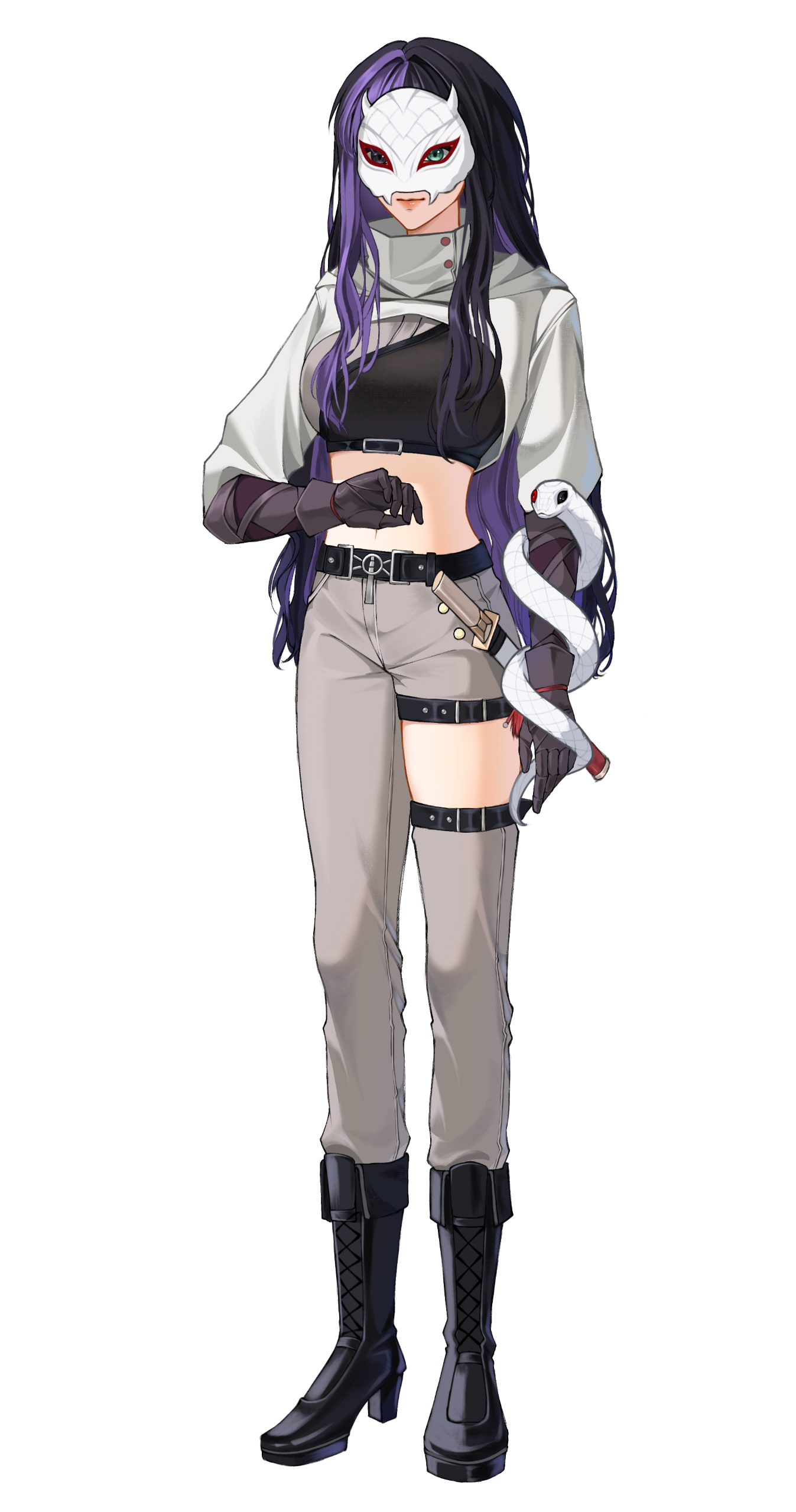 Shiromi Matou's appearance in the real world and in Honmaru is different. This was an uncommon phenomenon that only happened because Matou traveled through the timeline using Honmaru's time machine. When she's injured in the Honmaru, it doesn't appear on her body in the real world, only in her Honmaru appearance. But, if she was to get injured in the real world, the scar would appear in her Honmaru body.In the real world, she has a chest-length wavy white hair with purple peek-a-boo. She doesn't have any scars from her normal appearance.In the Honmaru, she has short white hair with an under-cut on her left side, and she still has the purple peek-a-boo. There's a cut scar on her left cheek and a burn scar on her right hand. She usually covers her hands with a bandage, only a few of her Touken Danshis know about her scar under the bandage.Before becoming a Saniwa, she has usual green eyes, but after being awakened twice, she has a blue-ish glint in her eyes. It's more apparent in her Honmaru appearance, but if you look closely under the sunlight, you can also see it in the real world. She's 158 cm tall with ideal weight. She was 17 years old when she first awakened as a Saniwa.There are two Saniwa identification barcodes on both of her wrists from the Government of the Time. The first Honmaru barcode is on her right hand and the current Honmaru is on her left hand. The first Honmaru identification barcode is unreadable anymore because of her injury, including in her normal appearance. The barcode still can be seen under the special light, but it's unreadable.