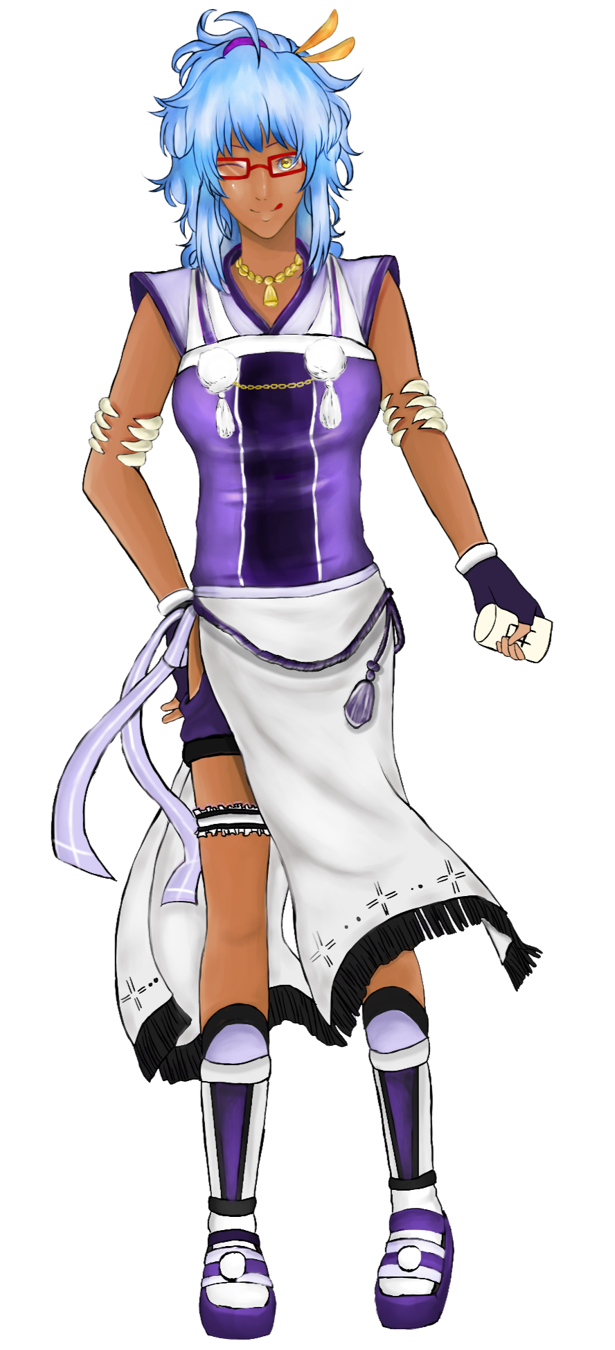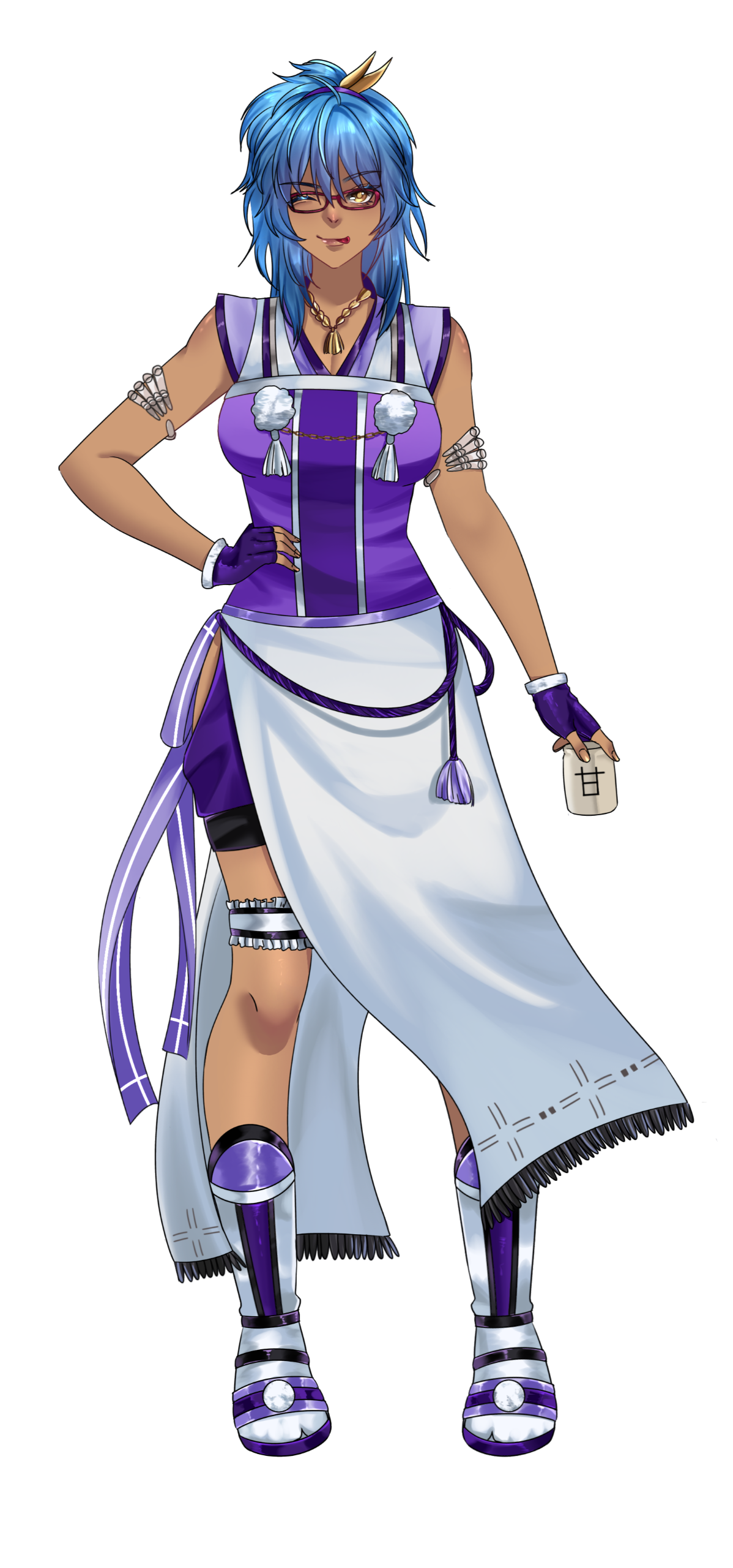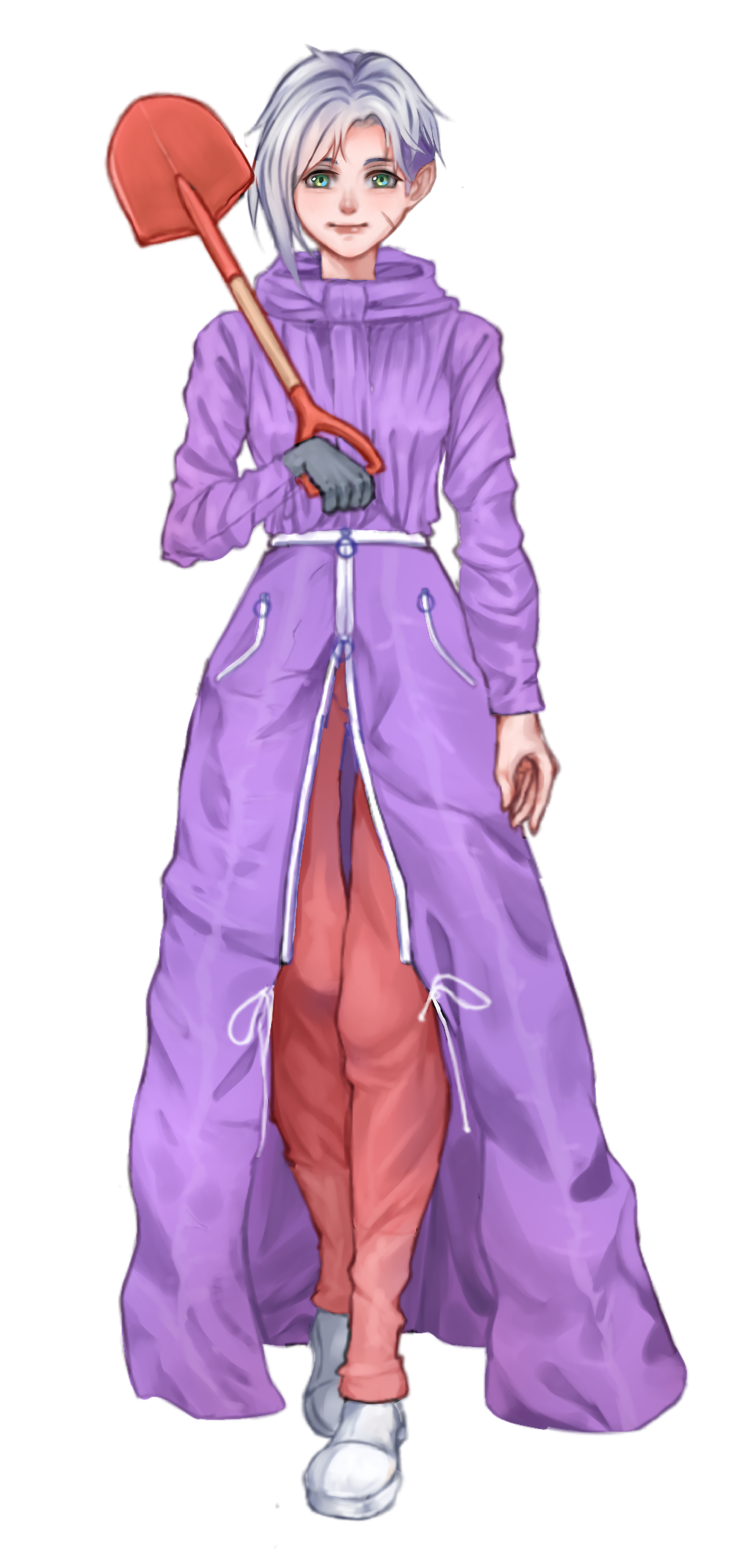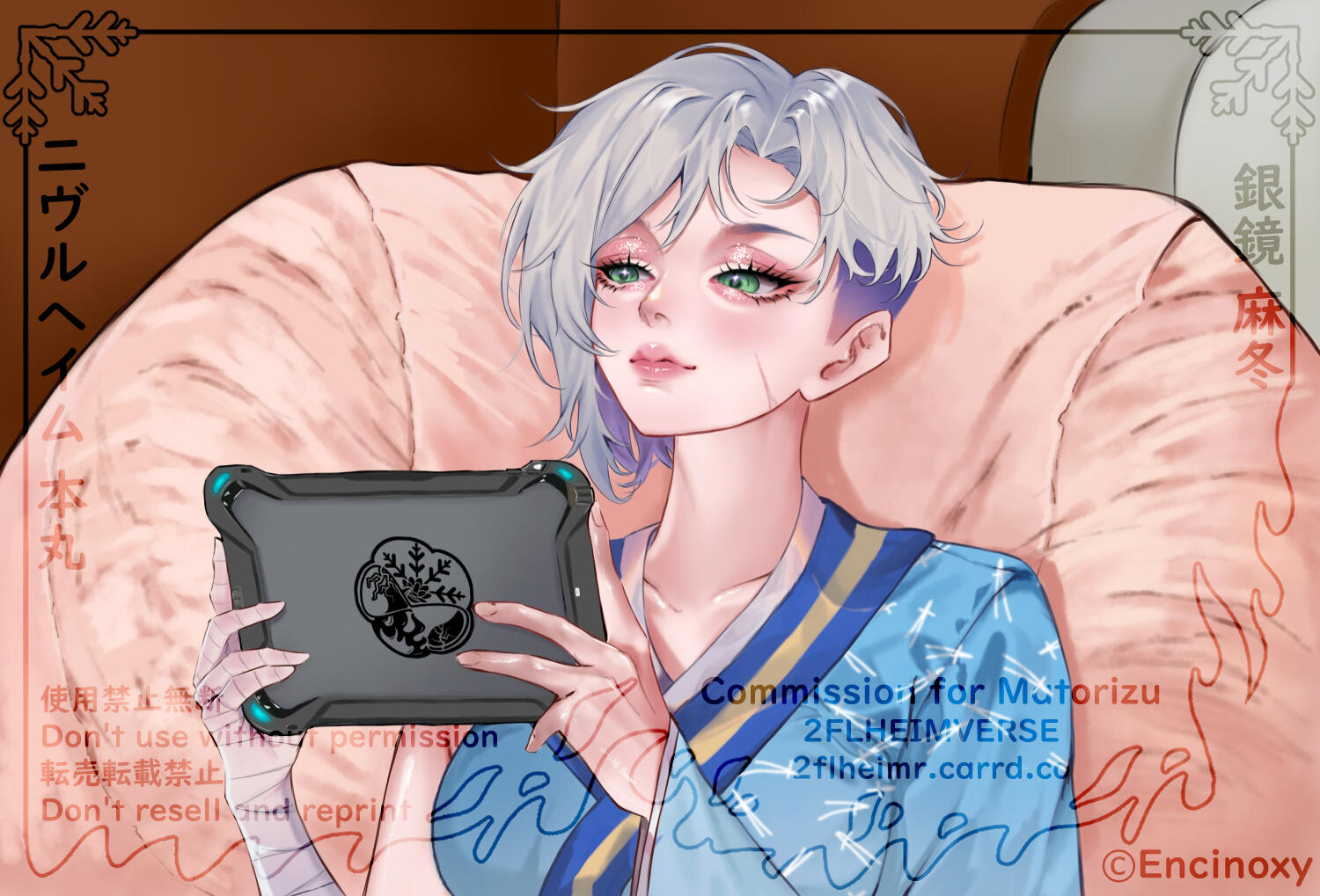 Shiromi Matou's appearance in the real world and in Honmaru is different. This was an uncommon phenomenon that only happened because Matou traveled through the timeline using Honmaru's time machine. When she's injured in the Honmaru, it doesn't appear on her body in the real world, only in her Honmaru appearance. But, if she was to get injured in the real world, the scar would appear in her Honmaru body.In the real world, she has a chest-length wavy white hair with purple peek-a-boo. She doesn't have any scars from her normal appearance.In the Honmaru, she has short white hair with an under-cut on her left side, and she still has the purple peek-a-boo. There's a cut scar on her left cheek and a burn scar on her right hand. She usually covers her hands with a bandage, only a few of her Touken Danshis know about her scar under the bandage.Before becoming a Saniwa, she has usual green eyes, but after being awakened twice, she has a blue-ish glint in her eyes. It's more apparent in her Honmaru appearance, but if you look closely under the sunlight, you can also see it in the real world. She's 158 cm tall with ideal weight. She was 17 years old when she first awakened as a Saniwa.There are two Saniwa identification barcodes on both of her wrists from the Government of the Time. The first Honmaru barcode is on her right hand and the current Honmaru is on her left hand. The first Honmaru identification barcode is unreadable anymore because of her injury, including in her normal appearance. The barcode still can be seen under the special light, but it's unreadable.
