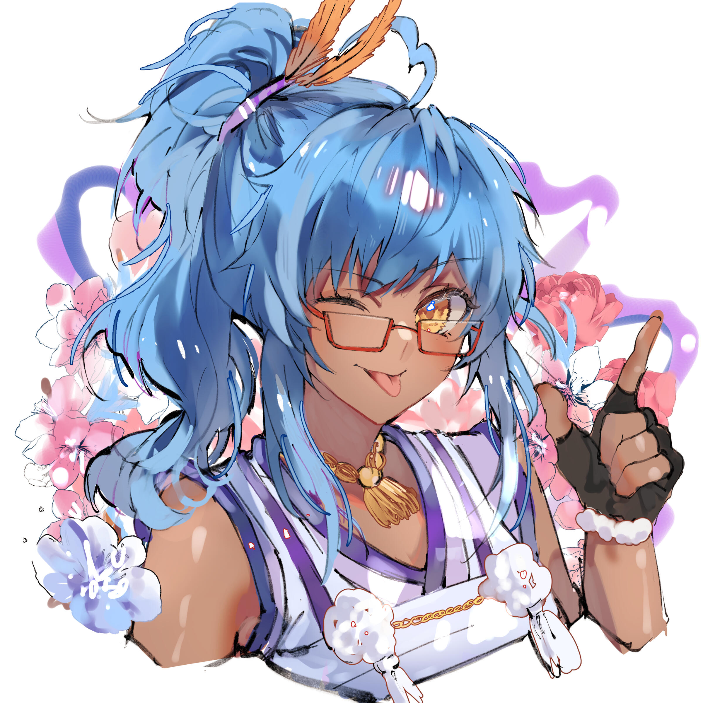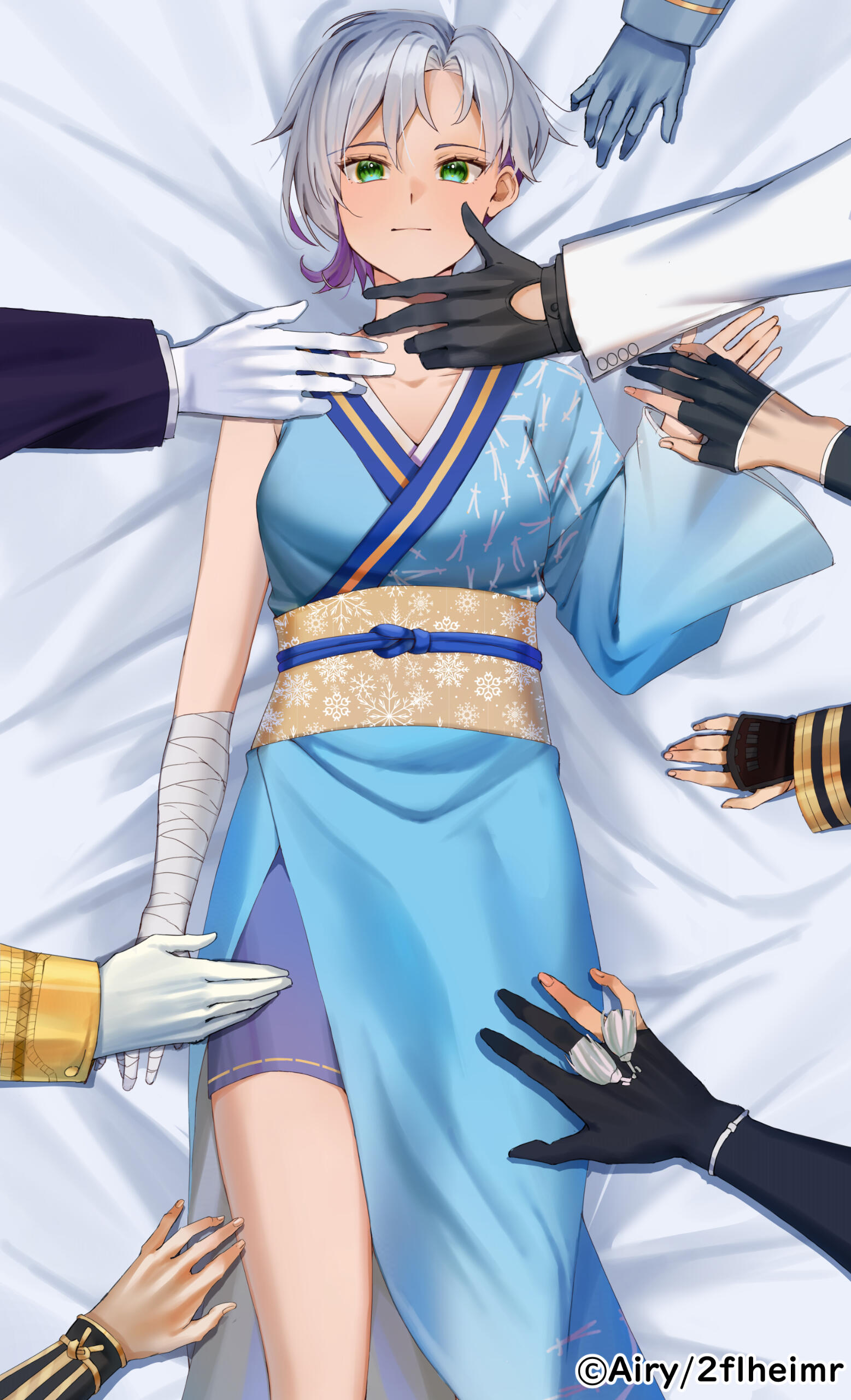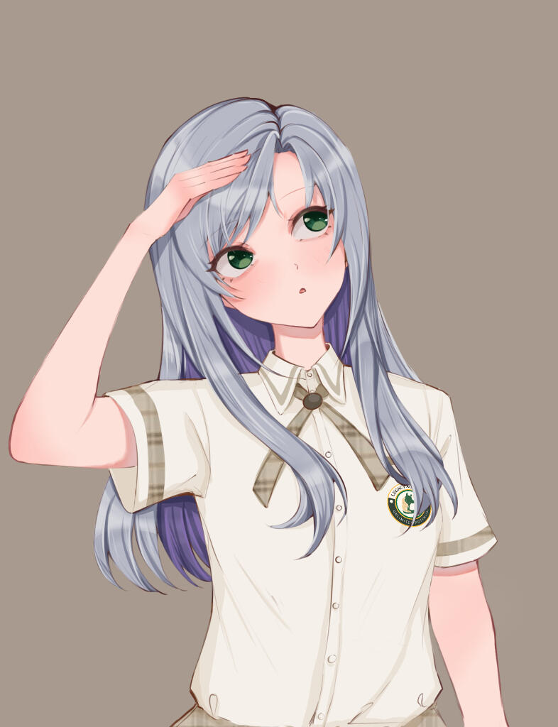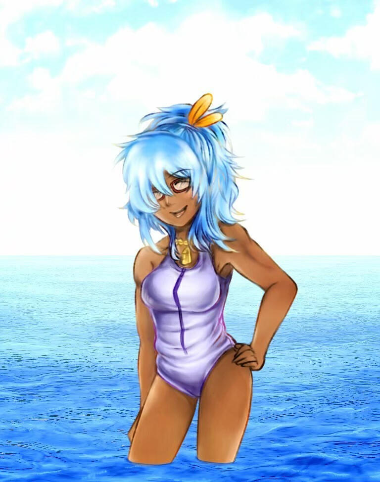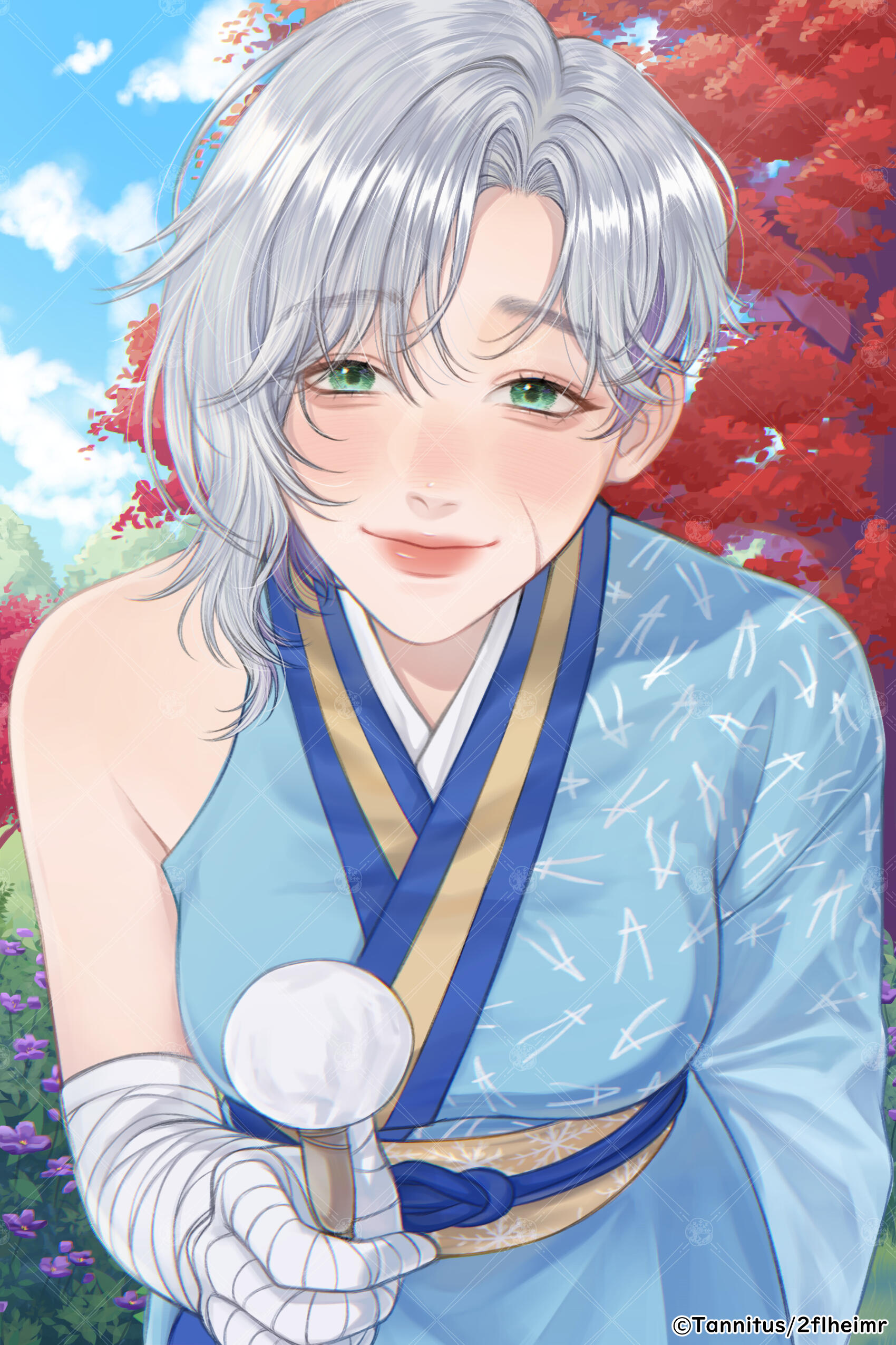 Shiromi Matou's appearance in the real world and in Honmaru is different. This was an uncommon phenomenon that only happened because Matou traveled through the timeline using Honmaru's time machine. When she's injured in the Honmaru, it doesn't appear on her body in the real world, only in her Honmaru appearance. But, if she was to get injured in the real world, the scar would appear in her Honmaru body.In the real world, she has a chest-length wavy white hair with purple peek-a-boo. She doesn't have any scars from her normal appearance.In the Honmaru, she has short white hair with an under-cut on her left side, and she still has the purple peek-a-boo. There's a cut scar on her left cheek and a burn scar on her right hand. She usually covers her hands with a bandage, only a few of her Touken Danshis know about her scar under the bandage.Before becoming a Saniwa, she has usual green eyes, but after being awakened twice, she has a blue-ish glint in her eyes. It's more apparent in her Honmaru appearance, but if you look closely under the sunlight, you can also see it in the real world. She's 158 cm tall with ideal weight. She was 17 years old when she first awakened as a Saniwa.There are two Saniwa identification barcodes on both of her wrists from the Government of the Time. The first Honmaru barcode is on her right hand and the current Honmaru is on her left hand. The first Honmaru identification barcode is unreadable anymore because of her injury, including in her normal appearance. The barcode still can be seen under the special light, but it's unreadable.
